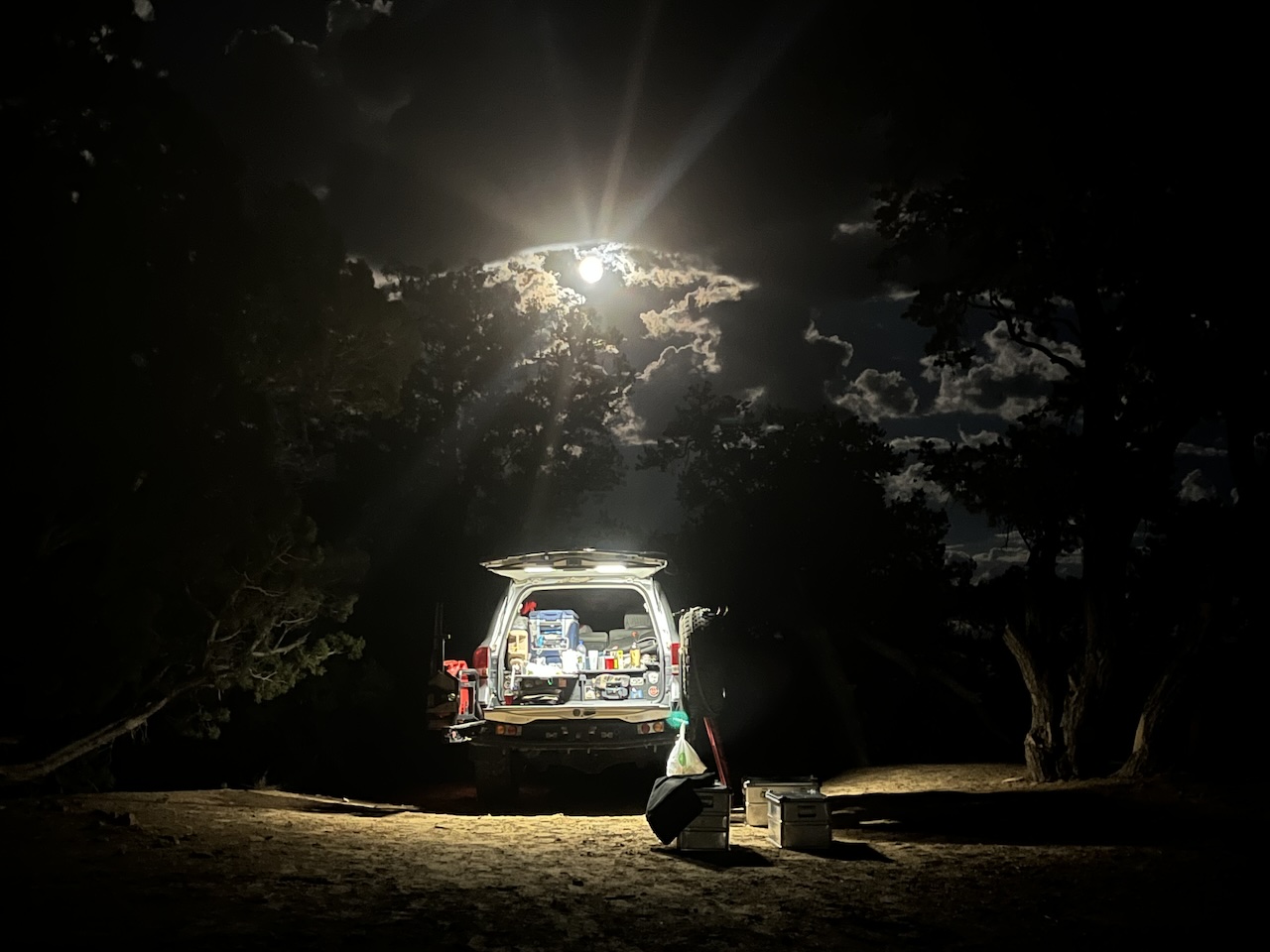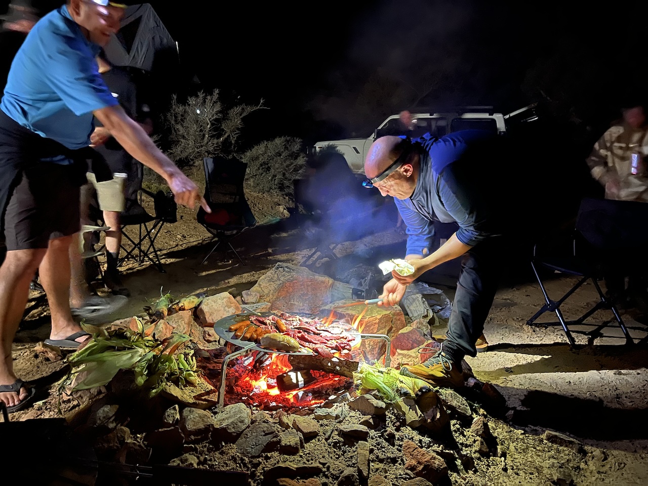 Our camp for the night was a "hidden gem" visited two years prior—a spot so remote it doesn't appear on any map. Dinner was a rustic feast of charcoal-grilled steaks and corn. Surrounded by the crackle of the campfire, we lost track of time. By the time we looked at our watches, it was 3:00 AM. We might have indulged in a few too many drinks, but the stories about Land Cruisers never ran dry. It was the perfect final night in Moab.